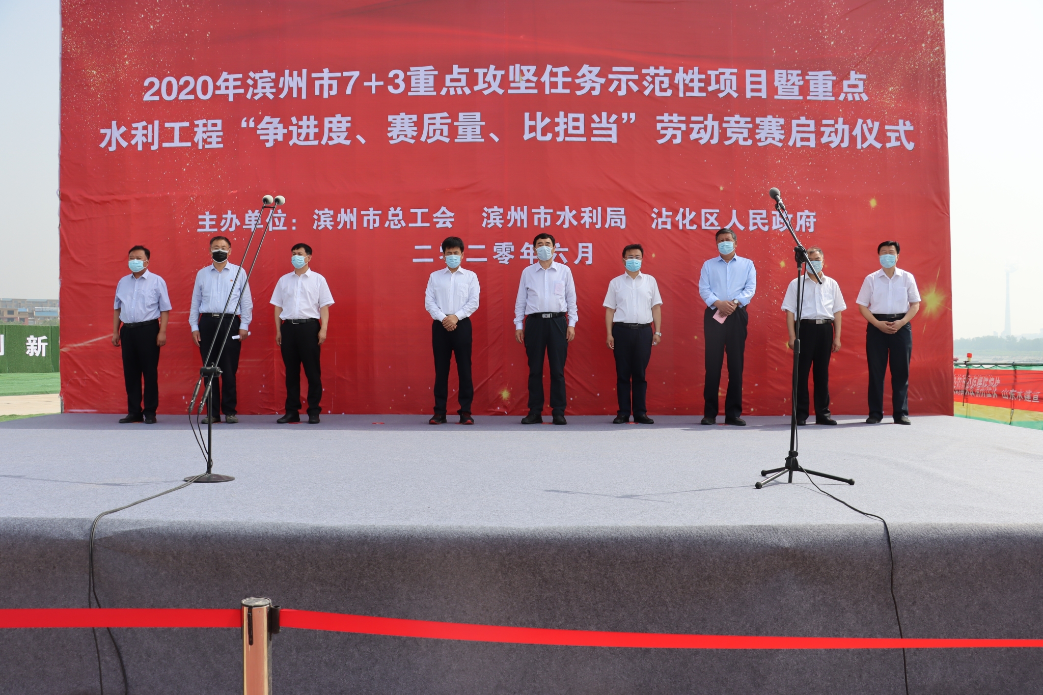 6月2日,山东省沾水建设工程有限公司参加由滨州市总工会、滨州市水利局、沾化区人民政府联合主办的2020年滨州市7+3重点攻坚任务示范性项目暨重点水利工程“争进度、赛质量,比担当 ”劳动竞赛。